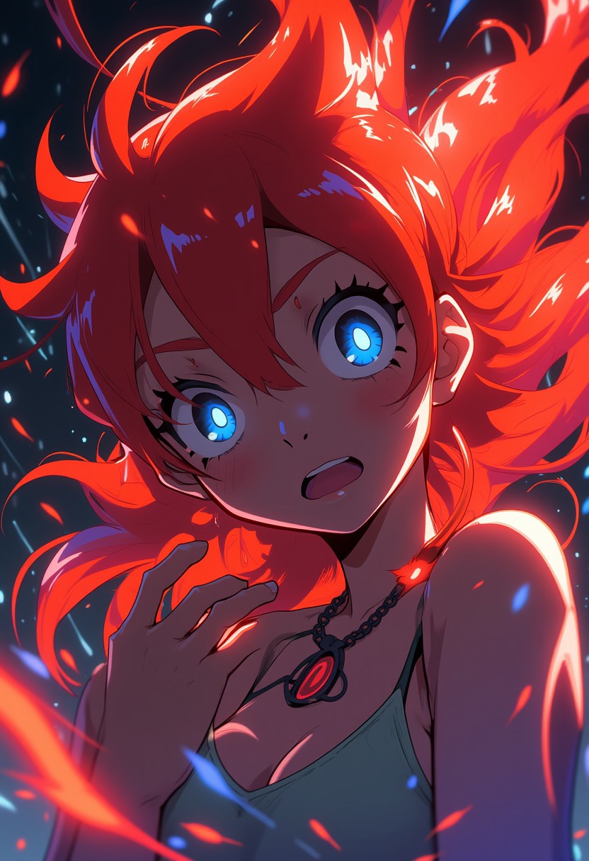 anime female character with very long fiery red hair and glowing blue eye surrounded by vibrant red and blue particles exuding intense energy, ultra dynamic pose and expression, movement, best quality, masterpiece, NijiEX style