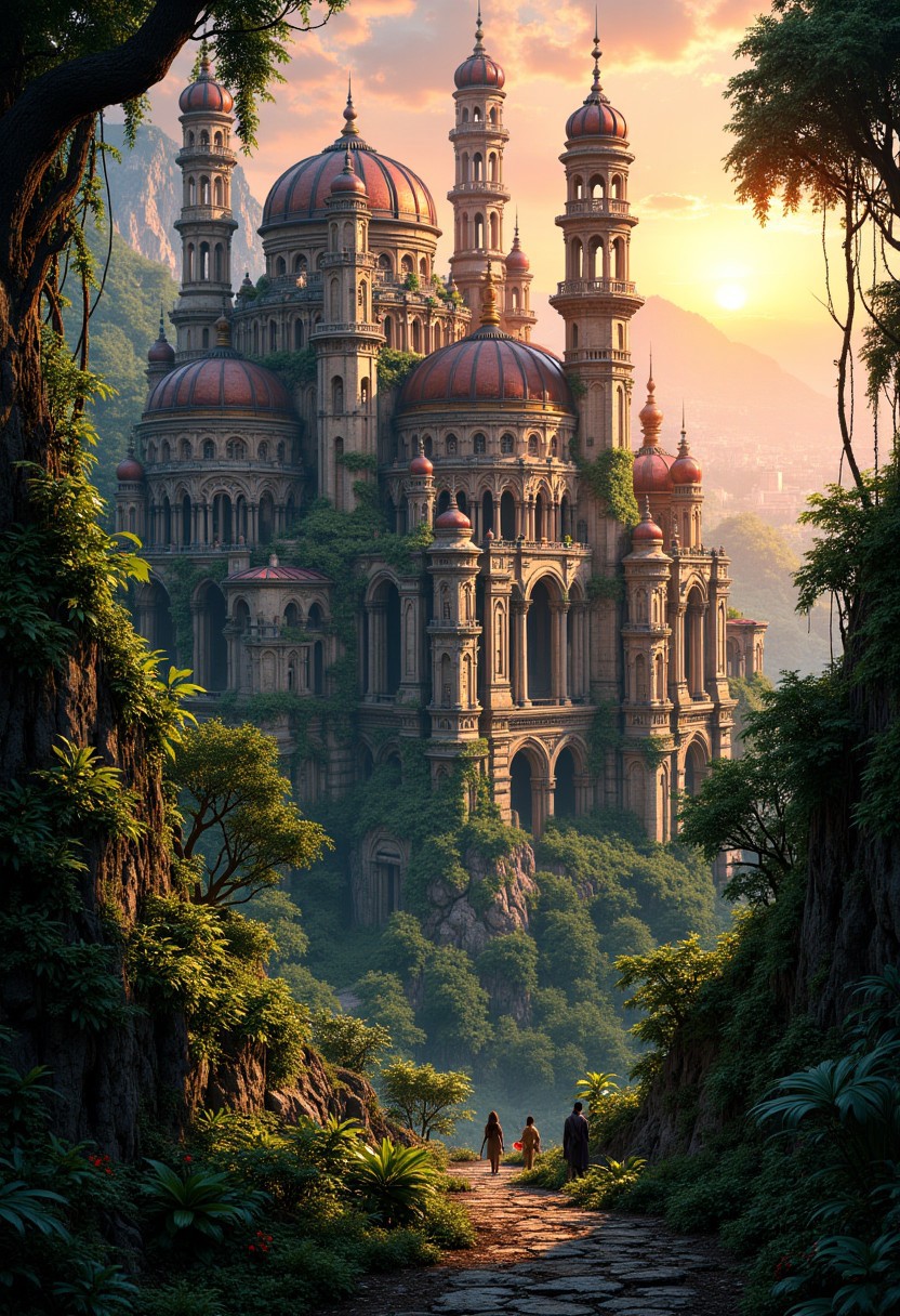 masterpiece, an ancient city with towers, domes and bubbles, overgrown by the jungle, creepers and vines, ivy, sunset, perfect lighting, mythp0rt