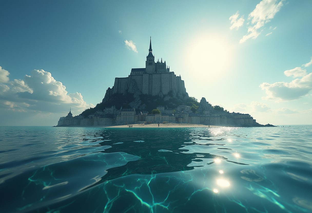 Vision of a dark fantasy version of the 'Mont Saint Michel', (re-imagined in game of thrones and house of the dragons world) Bright sunlight illuminates the crystal-clear water, beautiful sky with clouds, depth, creating a dramatic and stunting contrast.