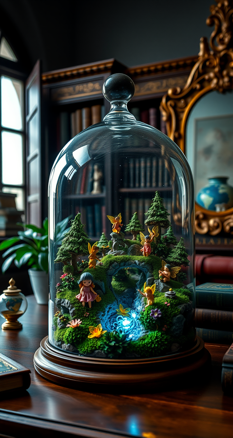 a tiny fairy world with infinitesimal forest and glades and rivers under glass bell jar. A whole society of mini luminescent magical fairies in a jar beautifully detailed and richly complex. Behind the jar is a dark study with handsome wood bookshelves lined with leatherbound books, a potted plant, and an ornately framed baroque mirror with desilvering spots.