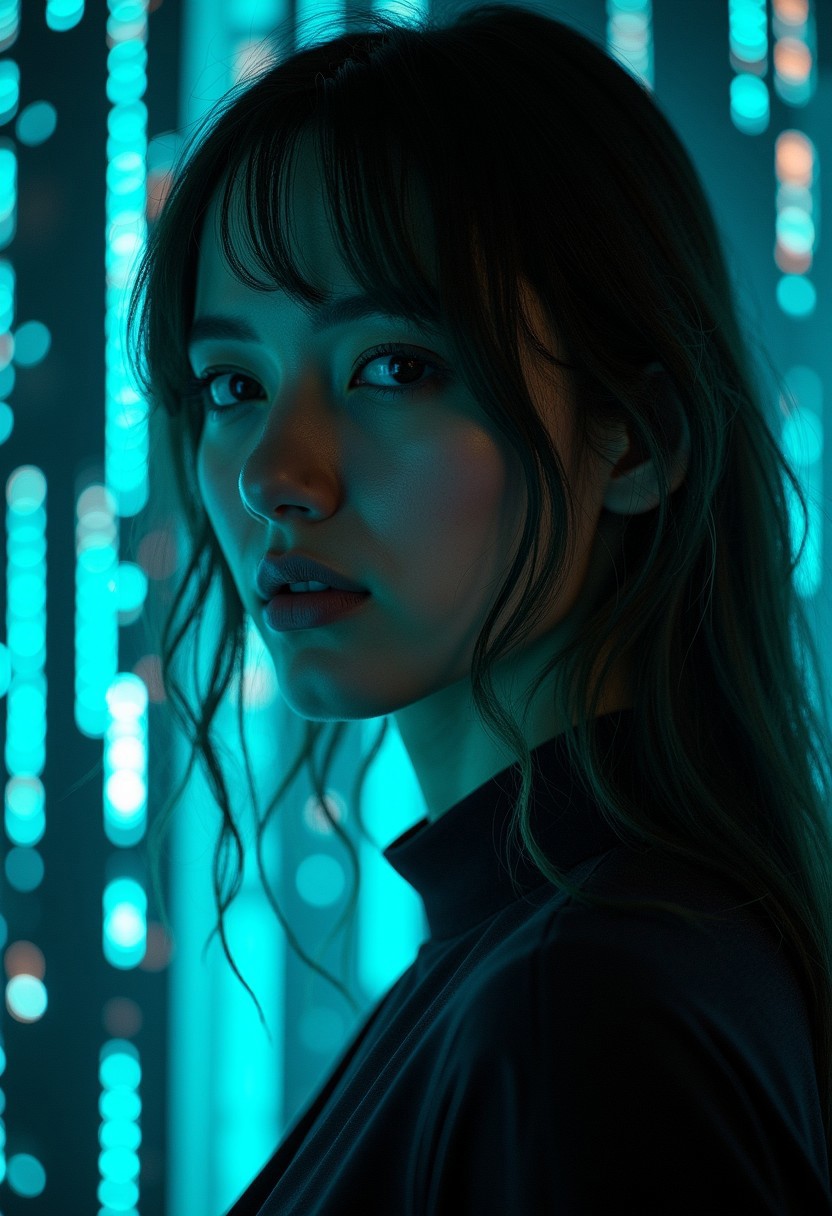 woman looking at camera, glowing lines, render, futuristic, glitch, matrix, 7-retrofuturism