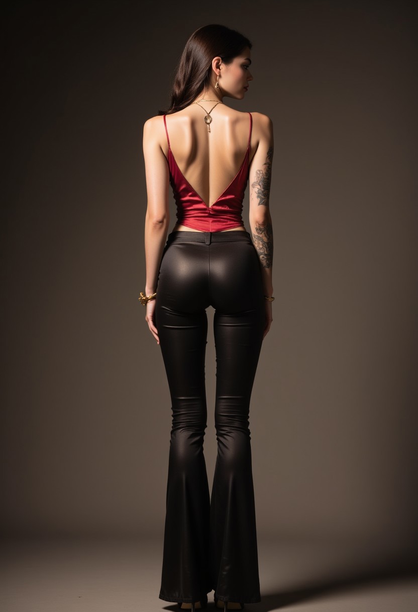 A stylish 19 year old Chinese fashionista. She is wearing a thin satin tank top, crimson red with gold thread embroidery, with visible cleavage. spaghetti straps, halter top, backless, naval piercing, tattoos on upper arm, back, looking away, black satin pants, flared legs, ankles, anklet, stilettos, full body shot