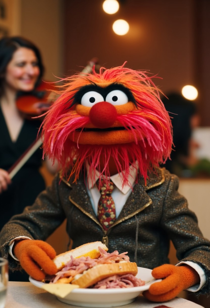 animal muppet wearing a suit and tie, eating a ham and cheese sandwich in a fine dining restaurant, a violin player in the background
