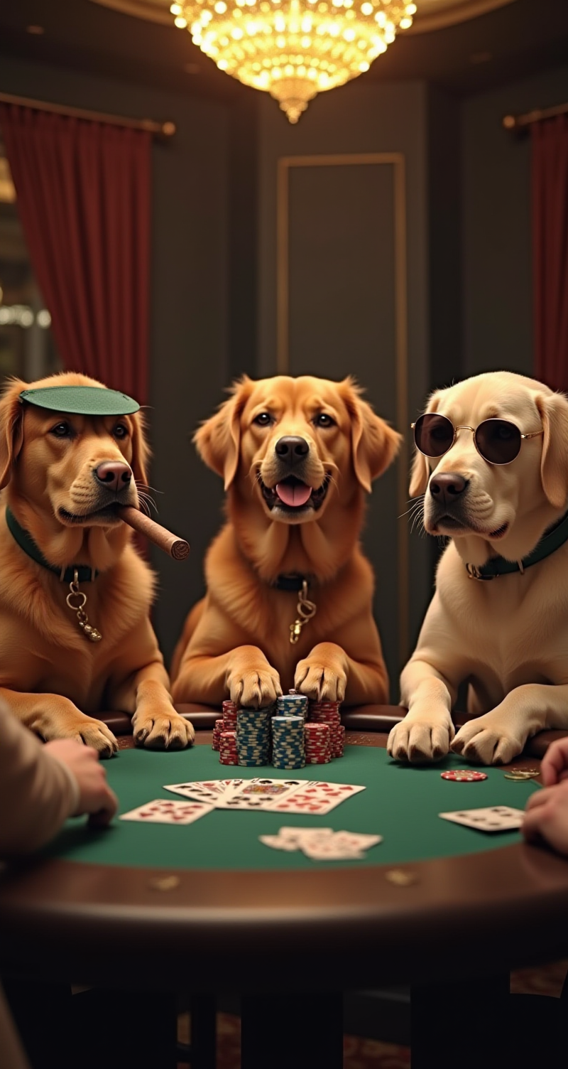 At a high-stakes poker table in a Las Vegas casino, a group of dogs—Golden Retrievers, Poodles, Bulldogs—are intensely focused on their game, each sitting upright in human-like postures. One dog is wearing a visor, another has a cigar hanging out of its mouth, and another is adjusting sunglasses. Piles of poker chips are stacked in front of them, while a Labrador nervously paws at his cards. The realism of the poker chips, card decks, and casino lighting makes the whole scene hilariously believable, as if this is just another night in Vegas.