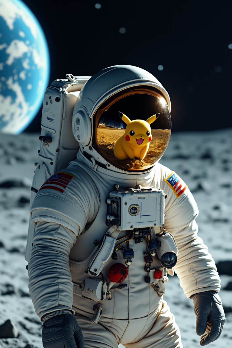 A highly detailed close-up of an astronaut standing on the surface of the moon, with Earth glowing in the background. The astronaut's helmet visor reflects a playful and surreal image of Pikachu, adding an unexpected twist to the otherwise serious scene. The texture of the astronaut's suit is ultra-detailed, showing every crease and reflection, while the surface of the moon appears textured and rugged. The image is rendered with high contrast and vibrant colors, capturing the glow of Earth, the clarity of Pikachu's reflection, and the astronaut's intricate suit. The overall scene has a hyper-realistic, surreal quality, blending fantasy with the stark reality of space. <lora:bokeh_flux_ntc:0.6>, <lora:FluxDFaeTasticDetails:0.6>