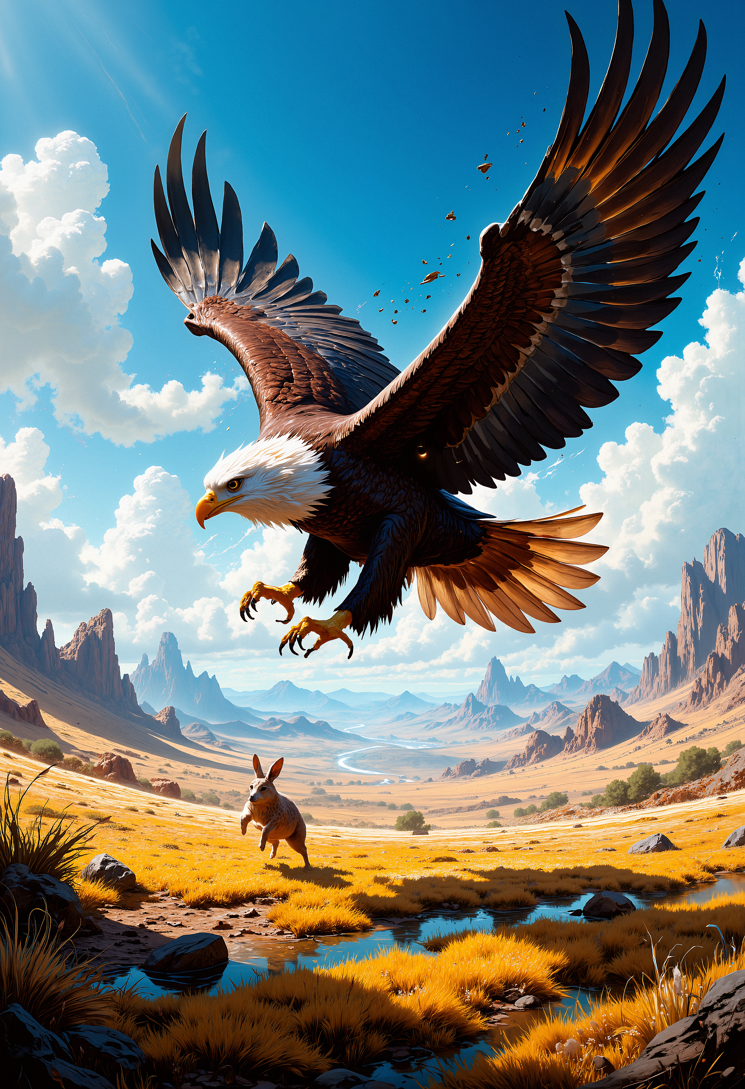 A detailed aerial view of a majestic eagle in mid-flight, with its wings fully extended, casting a large shadow on the ground below. Below the eagle, a small hare runs frantically, zig-zagging across a grassy plain. The sunlight casts long shadows, and the sense of speed and urgency is heightened by the movement of the eagleâs wings and the hare's desperate sprints. The sky is bright blue, with sparse white clouds, creating a vivid contrast between the eagle, the hare, and the vast open landscape. <lora:FluxMythP0rtr4itStyle:0.8> MythP0rt, <lora:aidmaImageUpgrader-FLUX-V0.1:0.33> detailmaximizer, <lora:flux_vividizer:0.33> <lora:artilands:0.77>
