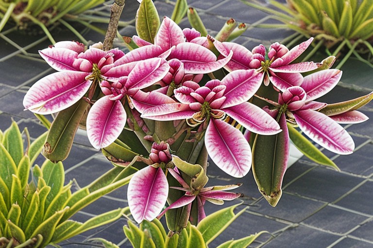 photorealistic, absurdres, nature photo of variegated gongbihua flowers on the back terrace of a country mansion, basking in the warmth of late afternoon spring sunlight