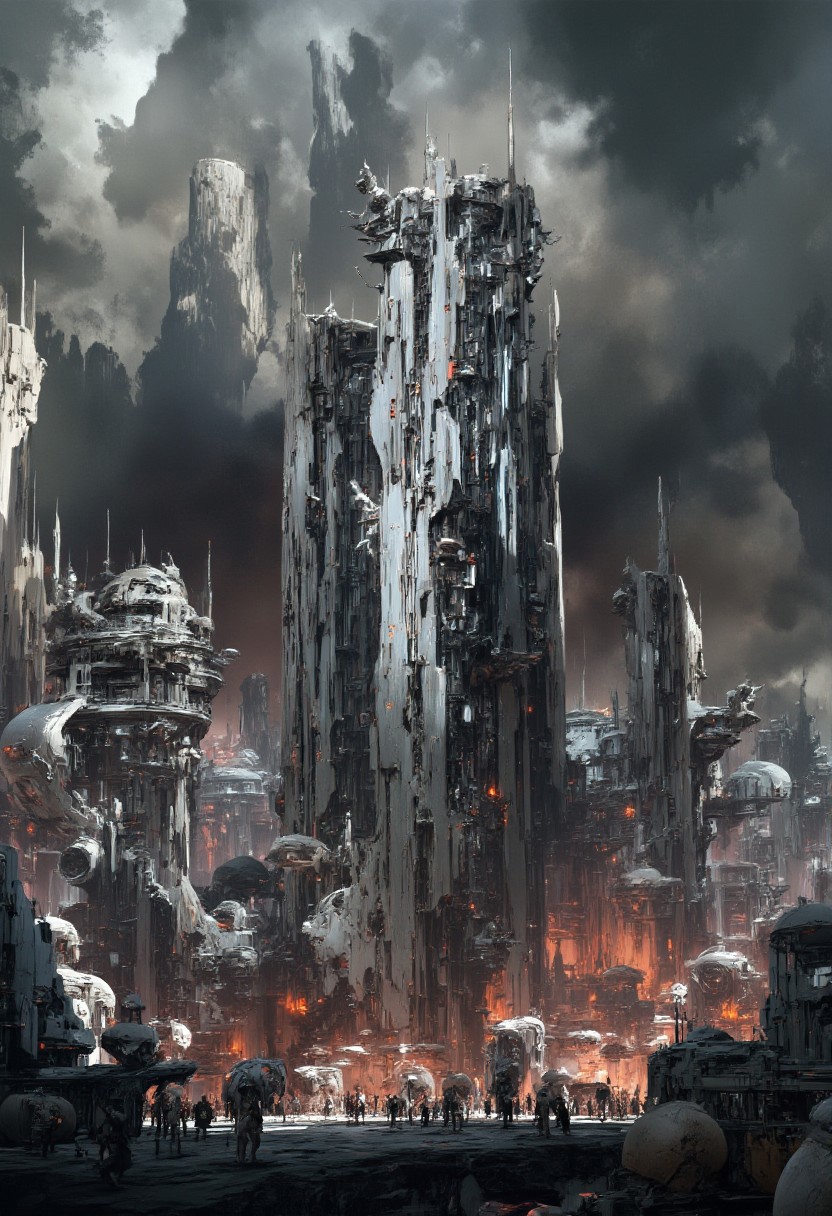 masterpiece, painterly, oil painting of a futuristic alien city, towers, skscrapers, domes, in white and chrome, surreal colours, mist, sunset, stormy sky, surreal clouds