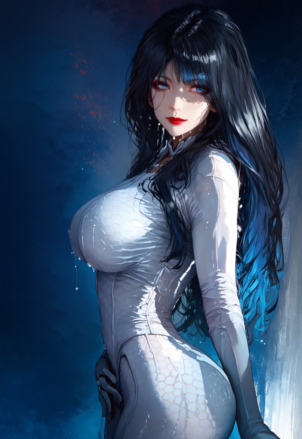 safe_pos, score_9, score_8_up, score_7_up, closeup, dramatic light, full body view, 1girl, long hair, bangs, blue eyes, large breasts, black hair, blue hair, multicolored hair, gradient hair, red lipstick, 1awsonsu1t, bodysuit, tight, white trim, dripping wet, temple background, focus from side, naughty smile, looking at viewer, arched back, LLDN, watercolor,