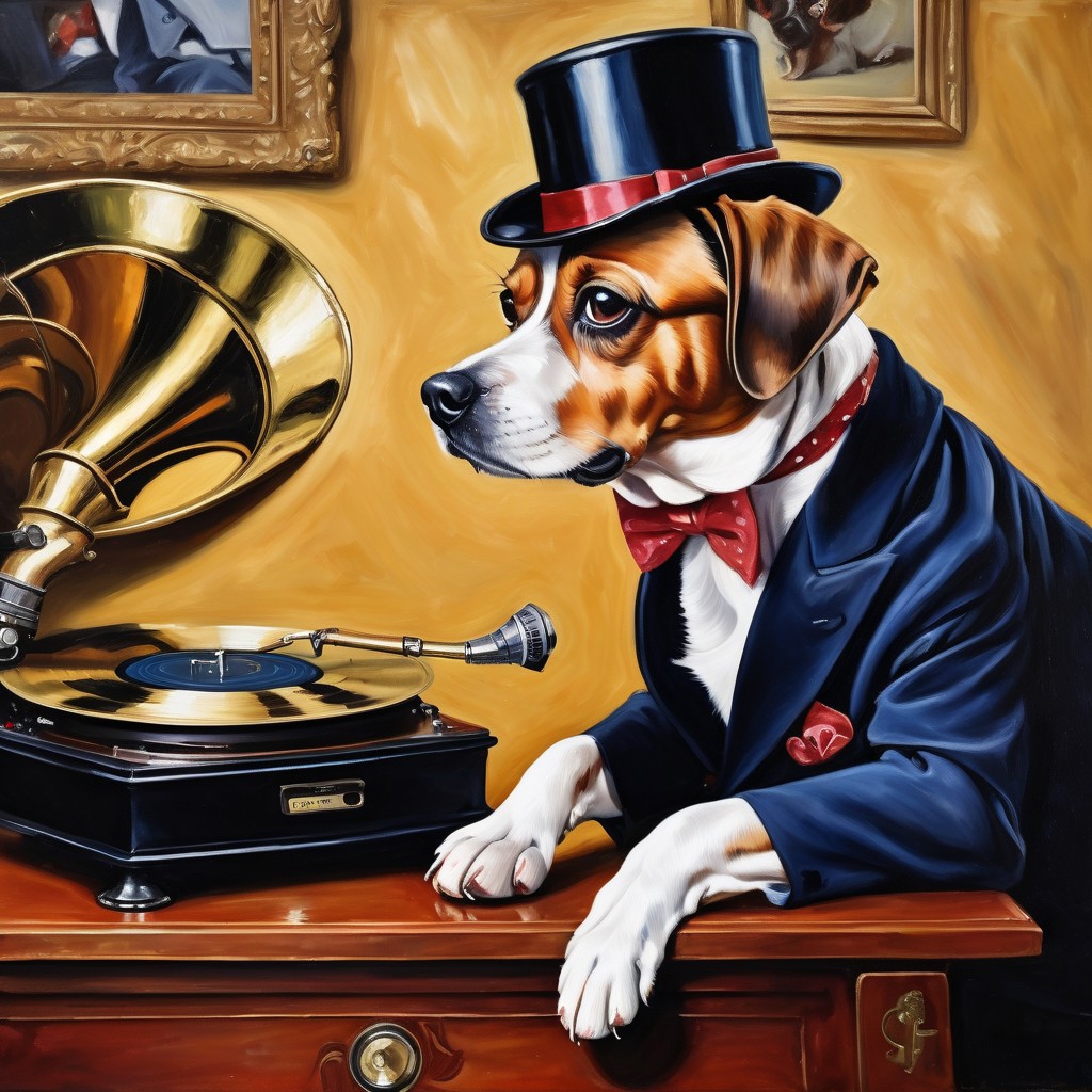 Oil painting, masterpiece, regal, fancy. A well-dressed dog named Puproy Doggerson III wags his tail in delight while listening to a fun new jazz record on an exquisite phonograph.