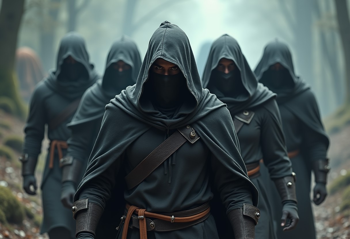 a photo-realistic party of dnd adventurers in a highly cinematic setting, highly detailed, all with hoods up and faces shrouded in shadow. Driven and determined in purpose, they stride forward with grim determination.