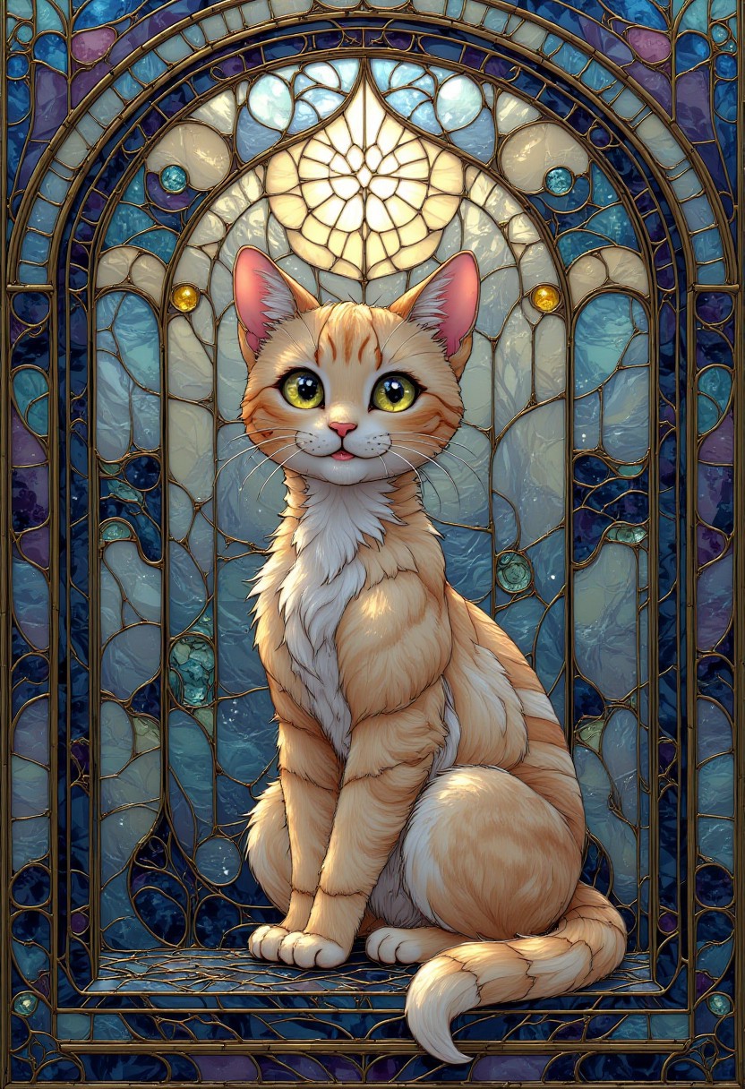 p1nk1est41n3dgl4ss, stained glass, British Shorthair Cat, from the year 3000, sci-fi influence, prominent technology, inspiration from space themes, sleek, sci fi, clean,