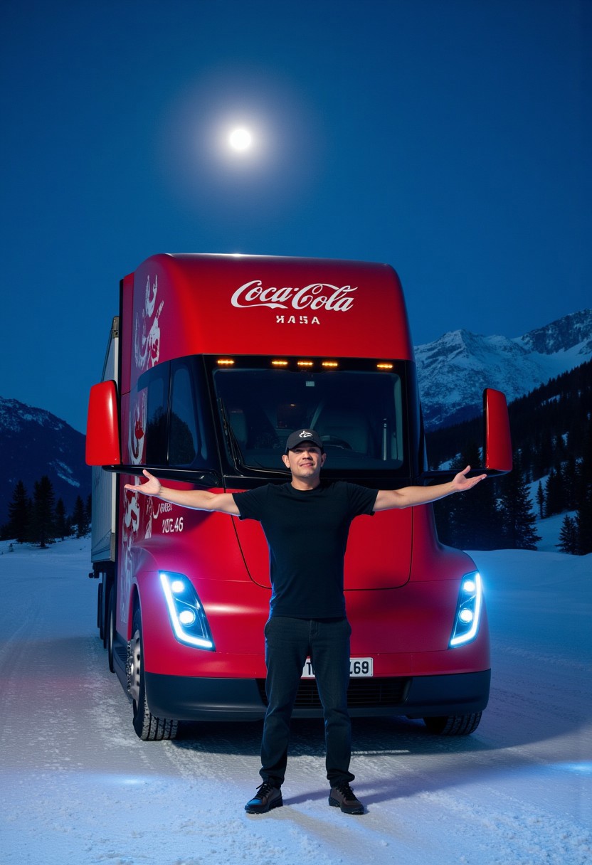 TOKKENEPA TOKTesla-Semi-shipped a man standing front on a Tesla semi-trailer truck . @carlosmanuelpe2 (19)Professional studio photography for T-shirt modeling, with wide full-body shots, with strong lighting, showing a stylish half-length man doing gymnastics wearing a light black, regular, round-neck T-shirt made of combed cotton, paired with casual pants. He smiles at the camera. The truck has the Tesla logo on the front and the door is open. TOKTesla-Semi-shipped is an electric truck a Coca-Cola truck driving through a snowy landscape at night. The truck is red and has a large advertisement on the side that says "Enjoy Coca-Cola." The truck has a Santa Claus figure on the back and is carrying a sack of gifts. The background is full of snow-covered mountains and trees, and there is a full moon in the sky. The overall atmosphere of the picture is festive and joyful. The logo is in the center of the image and is written in a modern sans-serif font. The word “SEMI” is in a larger font size and bolder than the rest of the text. Below the word, there is smaller text that says “SEMIBEASTS” in a smaller font size. The background of the logo is black and there are two blue lights on either side of the word. The lights shine and give the logo a futuristic and forward-thinking feel. The overall design is simple and minimalistic.