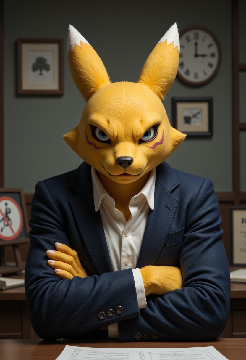 A photorealistic facial portrait of renamon, digimon with yellow fur, angry, mad, upset, wearing a formal blazer and shirt, sitting at a desk with arms crossed.
