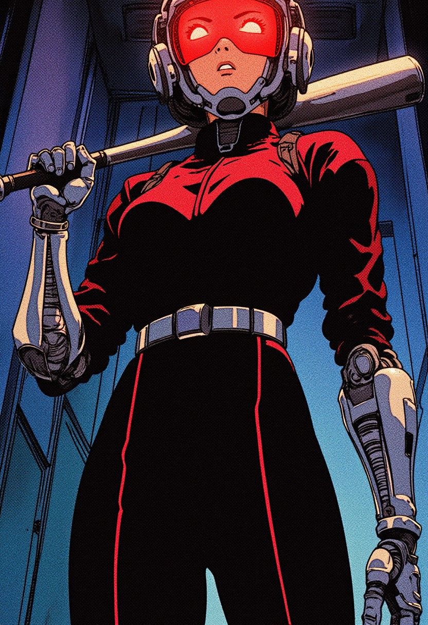 Detailed, vibrant, high contrast semi-realistic 90s dark fantasy anime. full body shot from below, slim female mech pilot black latex suit, horizontal red lines across the suit, prosthetic robotic arm with intricate piping and wiring metallic color arm, slim body type, small breasts, tall stature, long legs, futuristic helmet with a scope and visor fully covers her face, visor has bright red glow, holding metallic baseball bat on her shoulder, background is narrow dark corridor,