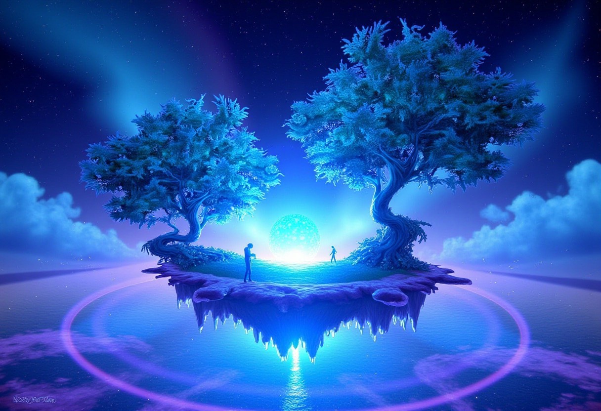 Imagine a vast floating island in the sky, where the ground is made of soft, glowing crystals that shimmer in shades of blue, purple, and pink. Giant, twisted trees with leaves like flowing ribbons stretch towards the starry night sky. In the center, a serene lake reflects the shimmering auroras above. Tiny, ethereal fireflies dance around, leaving trails of sparkling light. A gentle breeze carries the sound of distant, mystical chimes. olympusd450, detailmaximizer