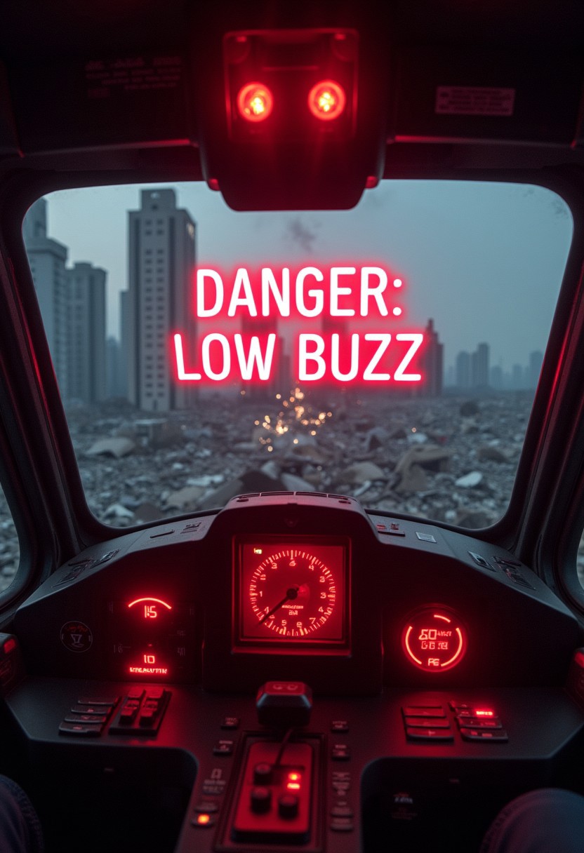 POV Gundam pilot cockpit, red warning lights flashing, the text "DANGER: LOW BUZZ" is projected on the front panel overlaying the view of city ruins from all of the fighting, the lower control panel shows a nearly depleted fuel indicator, steam hisses from the upper corner with sparks from sudden damage to the Gundam vehicle, this may be it!
