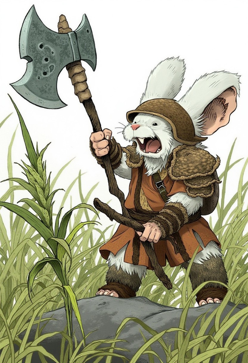 sbfte, a detailed closeup portrait of a male white mouseguard mouse, in barbarian attire, wielding a double-headed axe crafted from a sharp rock, roaring beside a towering blade of grass in an open field, with a walnut shell helmet and fur-lined boots.