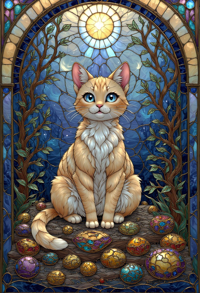 p1nk1est41n3dgl4ss, stained glass, A cat sitting on a pile of treasure, its fur shimmering like moonlight as it guards its hoard, detailmaximizer