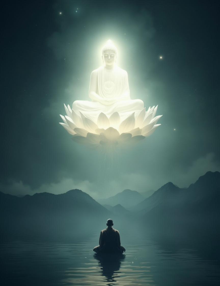 a serene and mystical scene with a strong spiritual atmosphere. At the top, a luminous, white Buddha is seated in a meditative posture on a large, radiant lotus flower. The Buddha emits a glowing light, creating a halo effect around his figure. The background is dark, with subtle hints of clouds or celestial formations, enhancing the divine and ethereal quality of the image. Below the Buddha, there is a solitary figure, likely a monk or a meditator, sitting in a meditative pose. This person is seated on a calm, reflective surface that resembles water, facing a landscape of misty mountains. The scene is tranquil, with the person seemingly in deep contemplation or meditation, gazing towards the mountains and the illuminated Buddha above. The image symbolizes a connection between the earthly and the divine, with the meditator looking up towards the Buddha, representing the aspiration for spiritual enlightenment. The overall atmosphere is one of peace, serenity, and profound spiritual presence.