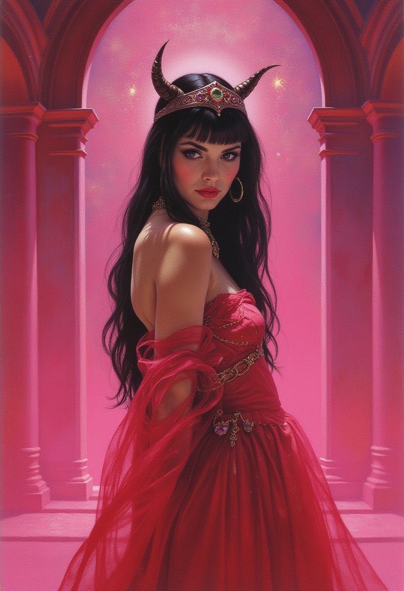 Frank Frazetta fantasy oil painting, closeup portrait of a sorceress princess standing in a pink, glittering chamber, her face serene and focused,