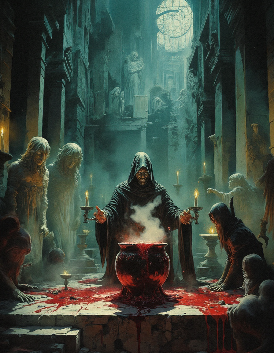 In a ruined cathedral, illuminated only by the dim light of black candles, a hooded alchemist performs a forbidden ritual. His face is hidden behind a silver mask engraved with dark symbols. In front of him, a cauldron bubbles with a thick, crimson liquid that emits steam in the shape of ghostly figures. around you, The statues of fallen angels slowly come to life, their eyes glowing with a spectral green light as they spread their broken wings. The marble floor is covered with ancient writings and marks of fresh blood, while the wind howls through the broken stained glass windows, carrying with it the echo of distant cries and screams. From the shadows, footsteps are heard approaching, as if someone or something is about to interrupt the ritual. <lora:sxz-Dark-Fantasy-v2-Flux:1> <lora:FluxDFaeTasticDetails:0.6>