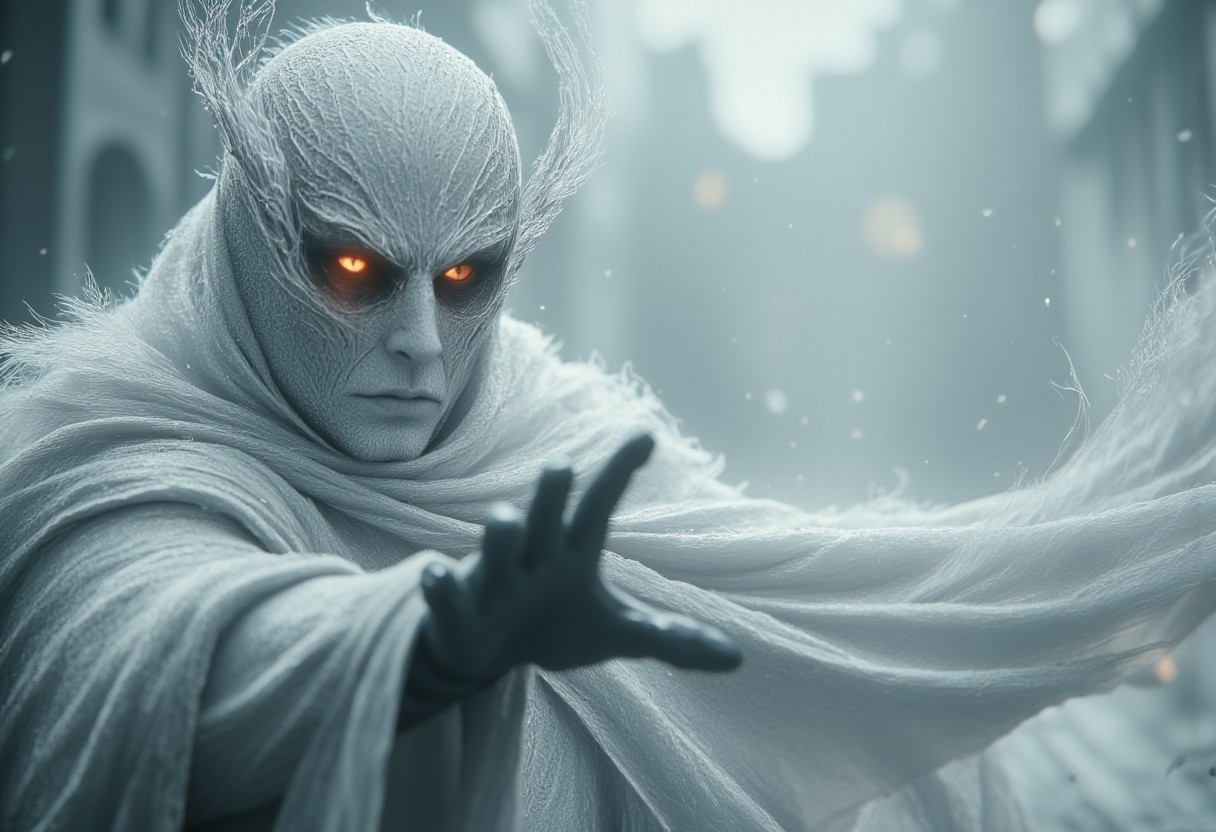 Open arms Pose, CloseUp Portrait, floating particles, billowing Hair, billowing Cape, Crystal clear atmosphere with sharp edges and high fidelity rendering, showcasing a cursed hkmagic witch in gleaming, shattered white armor. The armor has a glossy, pristine finish despite cracks revealing a faint inner glow. The focus is on a close-up of the ninja’s intricately designed helm, rendered with a modern art studio’s photographic precision. The helm’s shattered visor emits a piercing translucent white-amber light, creating clean streaks as the warrior’s swift motion is captured. The samurai’s long, radiant hair flows perfectly, each strand sharply defined against a backdrop of a dystopian, white-washed metropolis with futuristic, glossy architecture in ruins. The background is crisp and clear, with sharp details even in the mist. No grain or blur; everything is rendered with modern studio lighting, revealing the glossy, polished surfaces and intricate design of the armor. The overall mood combines haunting beauty with powerful precision, captured in a modern, highly detailed, and strikingly realistic photograph.