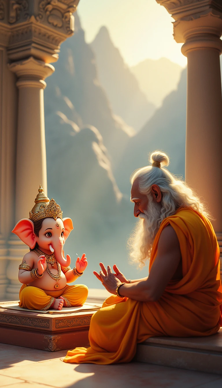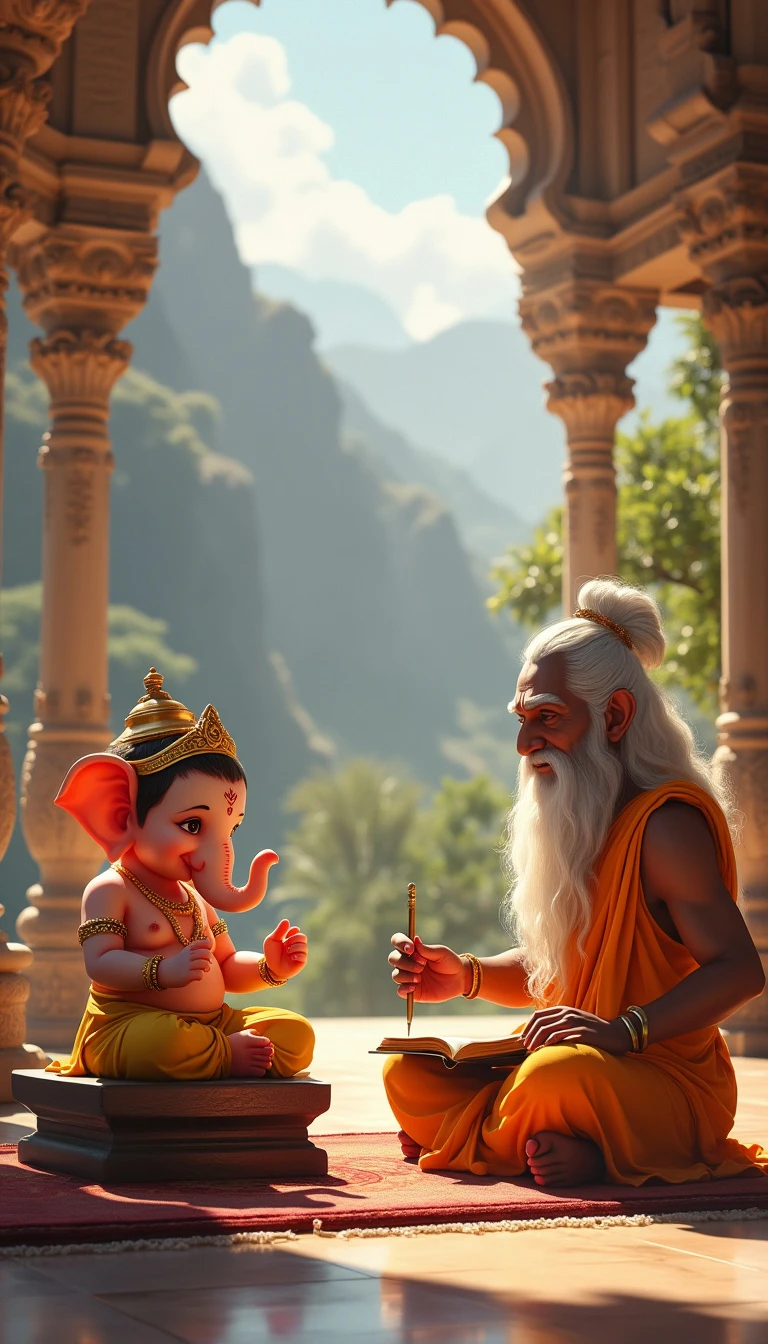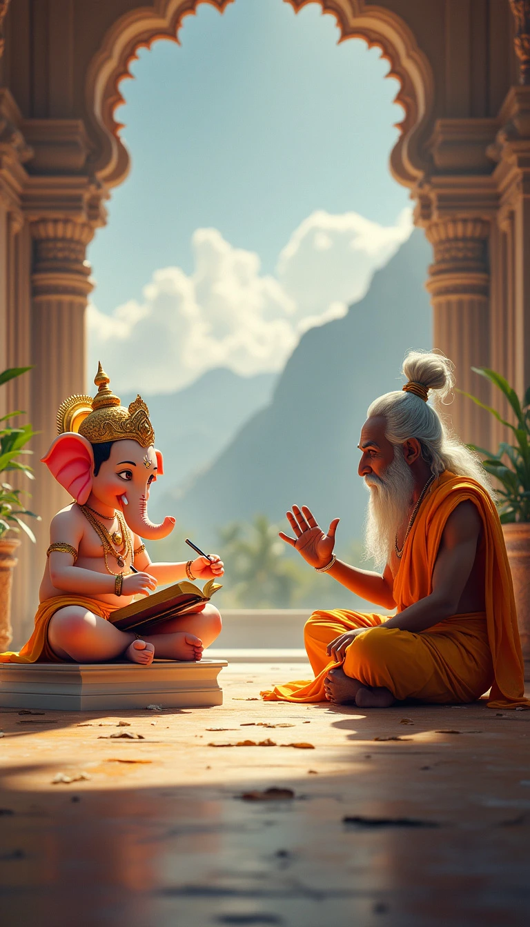 The image depicts a serene scene in a majestic palace courtyard. Little Ganpati , appearing youthful and divine, sits cross-legged seating comfortably, writing in a book with elephant tooth placed on pedestal. He has a soft, rounded face with a small, gently curved trunk, and his large, expressive eyes are focused on the book. Ganpati is adorned with a golden crown and simple jewelry, and his skin glows with a radiant light. He wears a yellow dhoti, and his wide elephant ears add a playful yet wise touch to his demeanor. Nearby, sage Vyasa is seated , positioned comfortably across from Ganpati. His long white beard and hair, tied in a top knot, highlight his venerable age. He is dressed in a simple orange robe that drapes over his lean frame, emphasizing his life of simplicity and spiritual dedication. Vyasa’s face is marked by deep lines of wisdom, and his sharp eyes convey both authority and kindness. He raises one hand, as if guiding Ganpati with his dictation, his relaxed yet attentive posture reflecting his role as a great sage. The sunlight streaming from above casts a divine glow over the scene, while the distant mountains in the background add to the serene atmosphere.