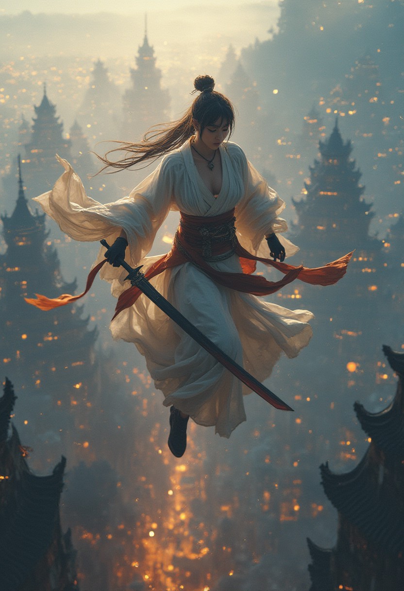 cinematic shot of xianxia cultivator flying on sword above cyberpunk city