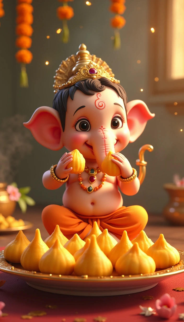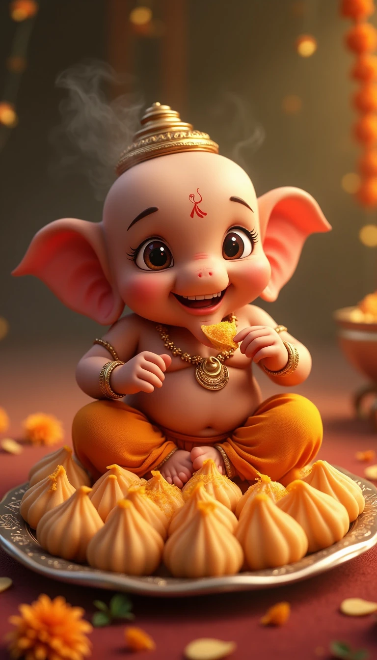 In this charming 3D cinematic cartoon-style scene, a playful little Ganapati, with big, expressive eyes and a joyful smile, is sitting cross-legged, delicately holding a modak in his hand. His plump, animated form is adorned with a simple yet vibrant dhoti and ornaments, exuding a divine but approachable charm. As he takes a bite of the modak, his face lights up with satisfaction. In front of him, there’s a large plate overflowing with perfectly shaped modaks, each glowing softly as they steam with warmth. The background is softly blurred, with golden hues and traditional decorations like marigold flowers, creating a divine yet playful atmosphere. The overall effect is heartwarming, capturing Ganapati’s love for modaks in a delightful, cinematic way.