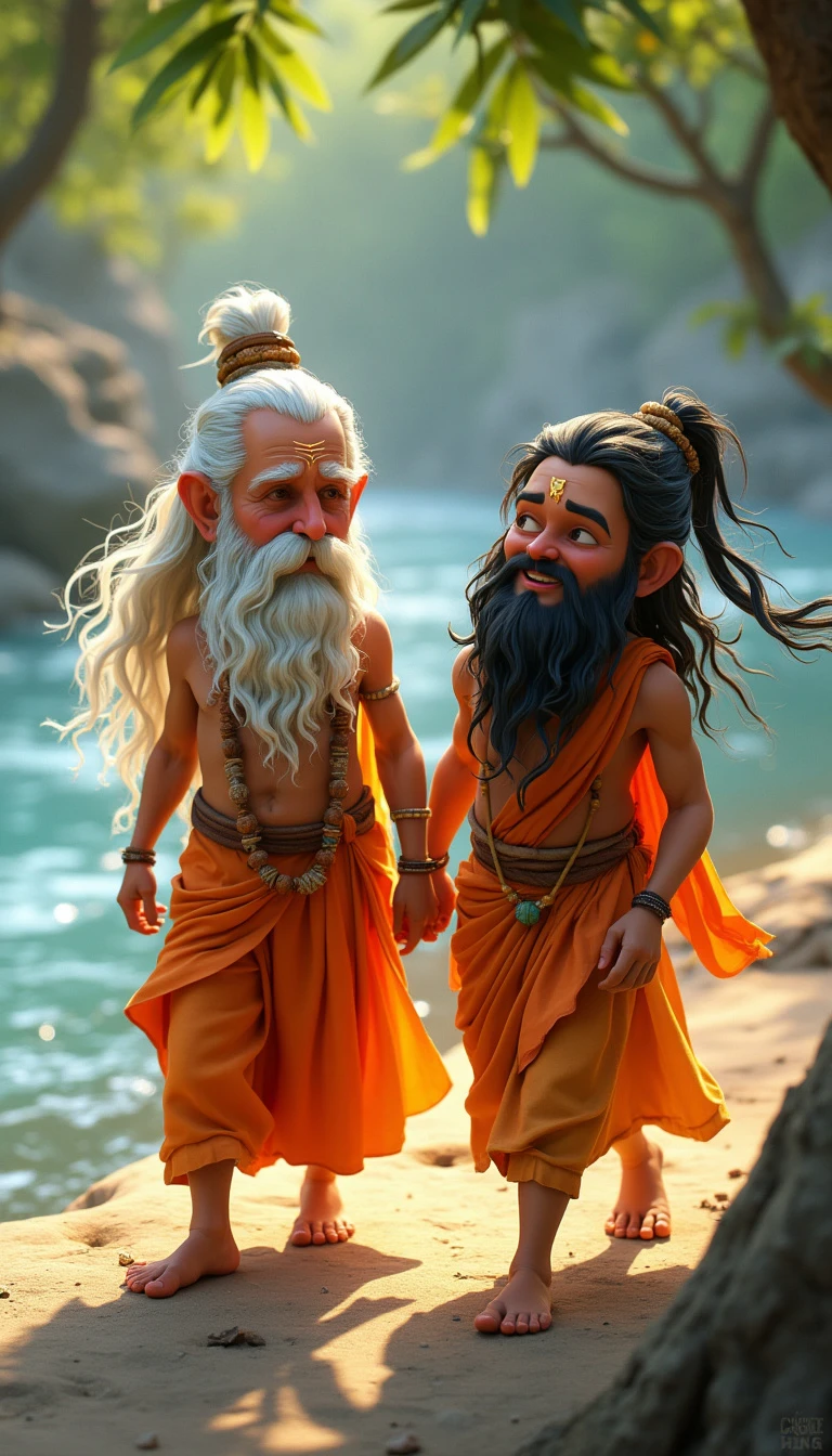 Maharshi Valmiki ( A Pixar style, cute image “Albus Dumbledore (Michael Gambon)” as an elderly ascetic man with a tilak on his forehead, and long white wavy hair tied in a bun with a small wooden bead band and a long white wavy beard. He is wearing simple orange men's Dhoti Saree and adorned with dried-up Rudraksha beads) and Bharadwaj ( A Pixar style ascetic man with a tilak on his forehead, and long black wavy hair tied in a bun with a small wooden bead band and a black wavy beard. He is wearing simple orange men's Dhoti Saree and adorned with dried-up Rudraksha beads. walks respectfully behind Valmiki) are walking by the riverside with a gentle smile. Surroundings: The Ganga River flows peacefully beside them, with trees swaying gently in the wind. The sunlight reflects off the water, creating a peaceful and loving atmosphere. Pixar style, highly detailed. No other character or text