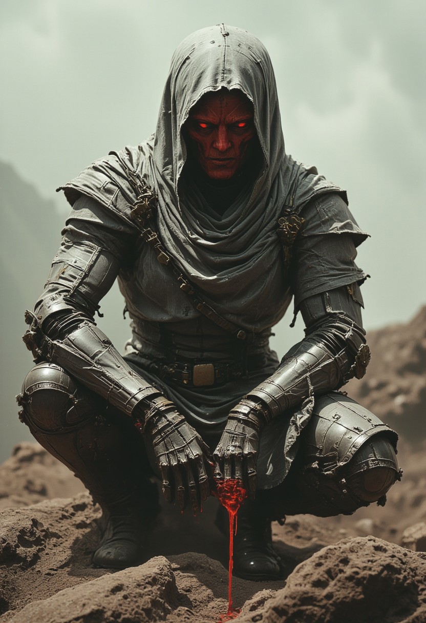 Image is a high-resolution, stylized photograph featuring a humanoid robot with a weathered, metallic body and intricate mechanical details. The robot is seated on rocky terrain, with a light gray, tattered cloak draped over its head and shoulders, partially obscuring its face. The robot's face is partially visible, showing a red, mask-like design with a solemn expression. The robot's hands are holding a small, red object, adding a striking contrast to the muted, earthy tones of the surroundings. The overall scene conveys a sense of desolation and contemplation, with the robot appearing almost human-like in its posture and demeanor.