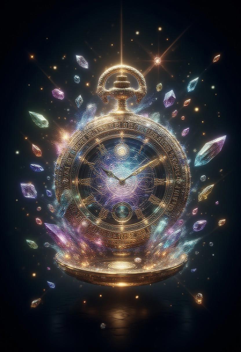 An intricately designed magic pocket watch, its case adorned with swirling arcane runes and encrusted with shimmering crystals. The watch face glows with a soft, ethereal light, each tick releasing a pulse of magical energy. The hands of the watch are made of gleaming gold, tracing glowing symbols instead of numbers. Crystals embedded in the watch shimmer with radiant hues of blue, purple, and green, casting beams of light into the air. The entire pocket watch floats, suspended by magical energy, with delicate trails of light dancing around it. 4K, masterpiece, highly detailed and mystica