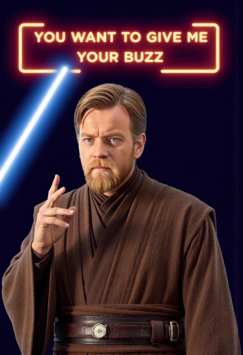 0b1wank3n0bi, Obiwan doing jedi mind trick, gently waving hand with two fingers extended, neon sign above him that says "You want to give me your buzz"