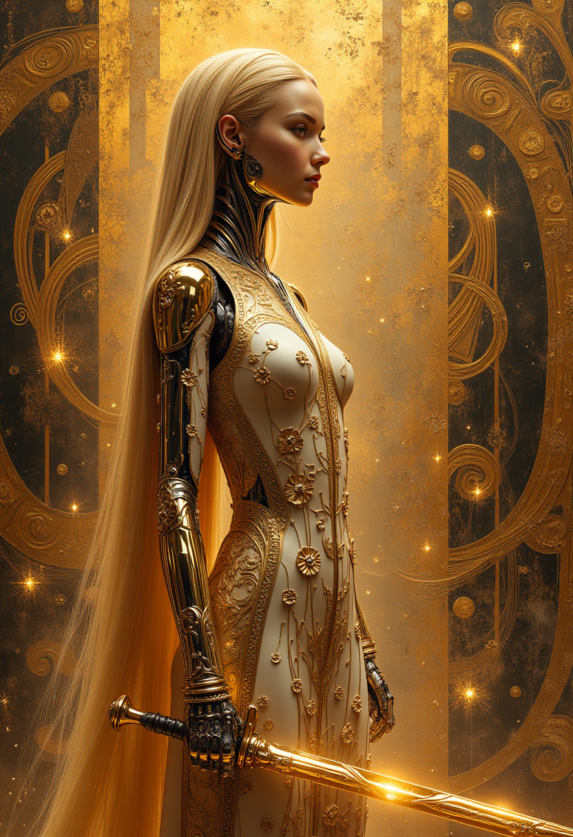 In this imaginative artwork, I envision a scene that blends the art style of Gustav Klimt with the aesthetic beauty of future mechanical technology. Klimt was an Austrian symbolist painter known for his unique floral decorative patterns, gold backgrounds, and abstract human figures. Applying this style to a cyborg idol girl warrior would create a visual effect that is both classical and modern, dreamy yet powerful. Photo description: In the center of the painting, a cyborg girl warrior stands with an elegant posture. Her body is made of smooth metal and transparent fiberglass, shimmering with soft and enchanting light. Her hair falls softly like golden silk, each strand seemingly embedded with tiny gems, emitting a warm glow. The mechanical girl's face is delicate and fine, her large eyes bright and focused, lips tightly closed as if waiting for the call to battle. The skin on her body features floral patterns similar to those often found in Klimt's works, but these patterns are meticulously engraved by metallic lines and smooth surfaces, showcasing both mechanical aesthetics and maintaining the art style's gracefulness. The warrior wears a dress adorned with gold feather edges and complex armor designs, elements also commonly seen in Klimt's work. Her weapon is an exquisitely crafted mechanical longsword, its blade composed of multiple layers of intersecting metal strips, each layer delicately engraved with abstract floral patterns, the tip of the sword flashing with sharp yet elegant light. The warrior stands in an environment full of futuristic technological feel, against a backdrop of large devices made from flowing metallic lines and shimmering electronic ribbons that seem to power her battle. The entire scene is shrouded in a layer of golden mist, giving off a sense of mystery and power simultaneously. This photo creates a unique charm and extraordinary capability for the cyborg idol girl warrior by combining Gustav Klimt's art style with the aesthetic beauty of future mechanical technology, presenting a visual effect that is both classical and modern, dreamy yet powerful. 8k,uhd,hdr,best quality,hyper detail,ray tracing,cinematic feel,professional photography lighting. midjourneyv6.1.