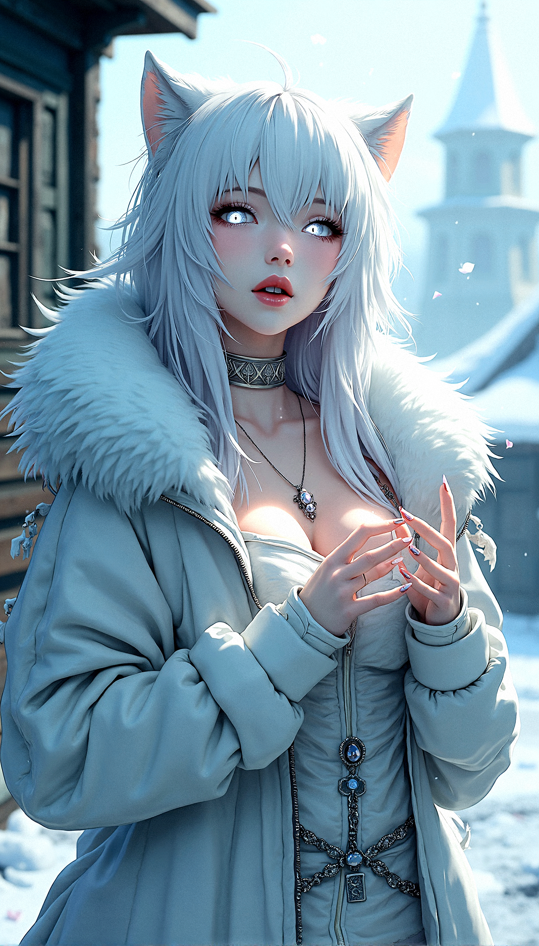 A stunning anime like figure of a voluptuous white haired woman, gothic fashion , large breast, alluring figure with subtle glowing white eyes with slit pupils, moist pink lips, fangs, sharp long fingernails, wearing a fluffy white wolf hooded jacket with long sleeves and her sleeves are past wrist, wearing beautiful necklace, soft lighting, realistic and delicate facial features, fallen snowpetal, photorealistic rendering. Natural light interplay on skin,Photorealistic shadow softness, Lifelike hair gloss , Photorealistic color grading, An abandoned watchtower, its structure groaning under the weight of the ice and snow.A cluster of old, weathered wooden cabins, their roofs and walls thick with snow and ice.She extends one arm upward, her gaze following it with an expression of longing or hope.