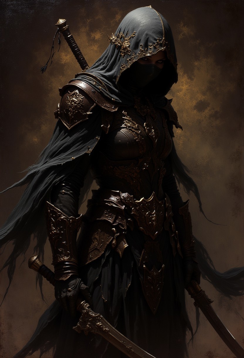 detailed renaissance oil painting, masterpiece, FredFraiStyle, female japanese ninja assassin, hood, chiascuro, silhoutetted, weapons, directional lighting, masterpiece, perfect composition, perfect hands, cowboy shot