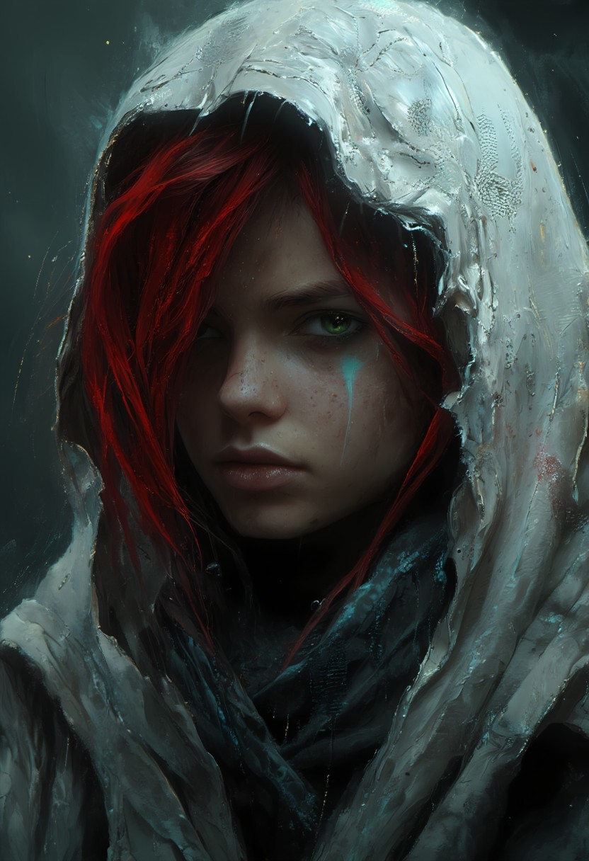 hyper-detailed, 4k, Soft-focus portrait, a close-up of a character with red hair and green eyes wearing a hooded white cloak looking to the side with a serious expression. The background is blurred suggesting a rainy or misty environment, backlight, vantablack <lora:- Flux1 - vanta_black_V2.0:1.0> <lora:MJvSX_Flux_LoRa_v1-000096:1.0>