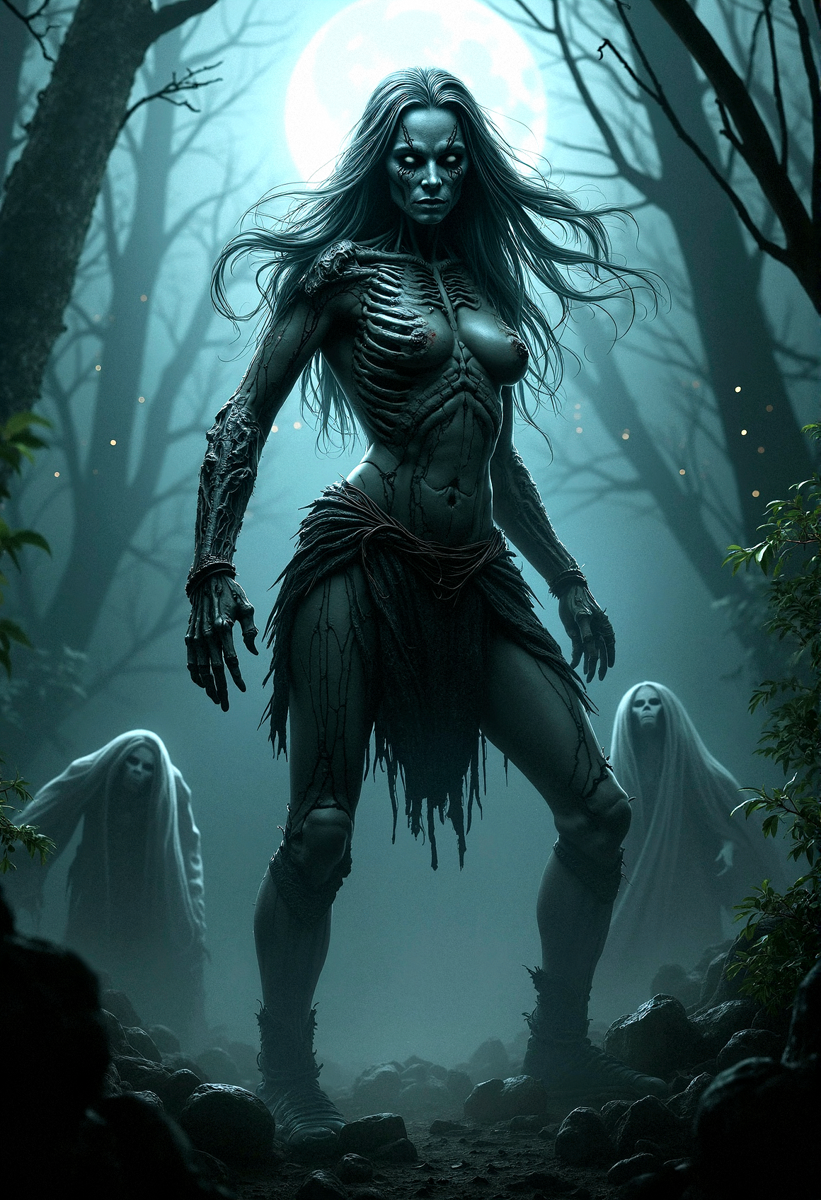 A hyperrealistic depiction of a rotting undead Amazoness warrior, towering and muscular, with intricate skeletal makeup that blends with her decaying beauty. She stands in a dynamic pose, her skeletal armor cracked and worn, surrounded by a dark jungle. Thick fog swirls around her, with light particles shining through from the moonlight. Her fierce expression and flowing, ethereal hair add to the menacing aura. The nighttime setting, realistic shadows, and eerie atmosphere are enhanced by ghostly apparitions lurking in the background.
