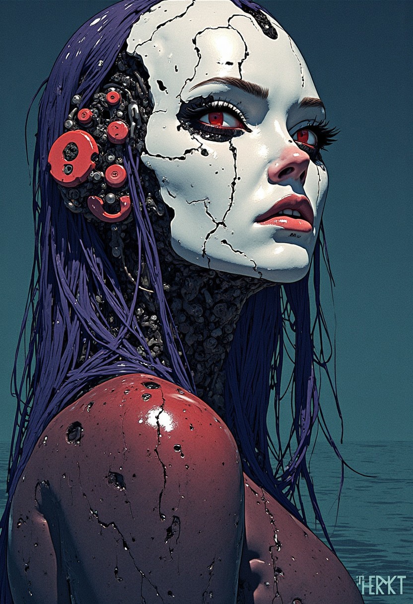 anime, cyberpunk, Detailed, bold lines, ultra realistic, horror, dim colors, ((cut hands)), (cut wires and pipes instead of hands) offcenter, floating on water, (the palate consists of white black and red),(no nose), ((Hole instead of nose)), washed out purple hair, messy hair, her long hair, scary menacing hubris expression, zoom in on face, view form a side, looking away from the camera, monster woman, smooth ceramic head with deep cracks like mask falls off piece by piece, dynamic pose, wet intricate slimy tentacles, reflective skin, visible intricate ornate detailed joints, upper body shot, wet skin, in the water, dark waters in the night, intricate pipes, ceramic with detailed joints, silky tentacles, smooth, sharp,