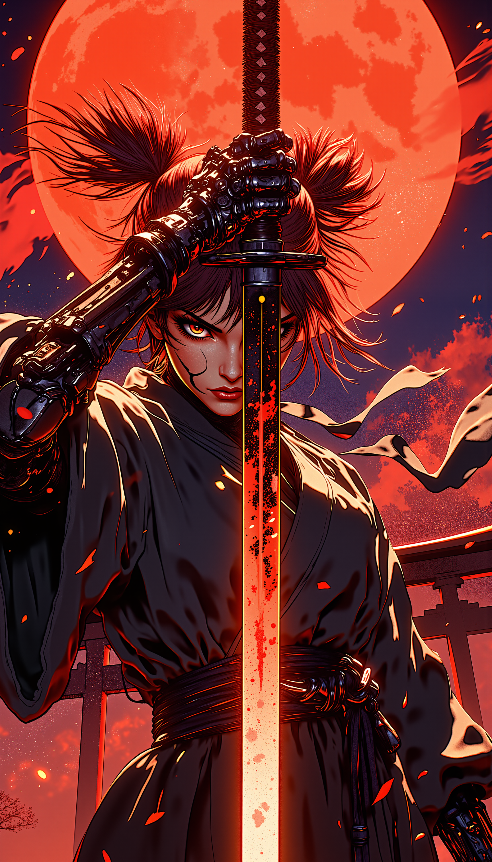 An overhead close-up shot captures the cyborg warrior as she lifts her katana high above her head, the blade dominating the frame and glowing with the crimson light of the red moon. The focus shifts from the sharp edge of the katana to her mechanical jaw and intense eyes beneath her short, double pom-pom hair. Her baggy kimono and flowing scarf add intricate textures to the scene as they ripple in the wind. In the background, blurred out, two mountains and a giant torii gate loom under the red moonlight, with volumetric fog and cyan-red lights creating an otherworldly ambiance retro cyberpunk anime, <lora:FluxFantasyWarriorsJapan:0.9>, hkwarrior, <lora:ImageUpgraderV2:0.5> , detailmaximizer <lora:RetroAnimeFluxV1:1> <lora:aidmaGLOWV4wc:0.4> , aidmaGlow,