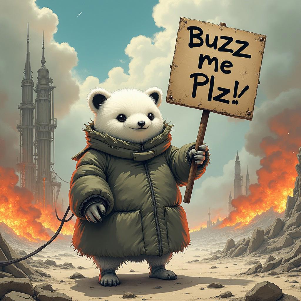 Blame! by Tsutomu Nihei like picture a cute white young tanuki is holding a sign which says "Buzz me Plz", explosions, dead sky, megastructure in background, tubes and cables everywhere easynegative, ng_deepnegative_v1_75t