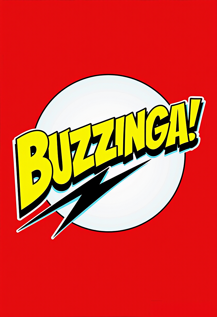 pop Art style . Create a design similar to the "Bazinga!" logo from "The Big Bang Theory." The background should be a solid red with a white circle in the center. The word "Buzzinga!" should appear in bold, yellow, comic book-style font with a thick black outline. Beneath the text, include two black lightning bolts stretching diagonally outward, just like in the original design. . bright colors, bold outlines, popular culture themes, ironic or kitsch