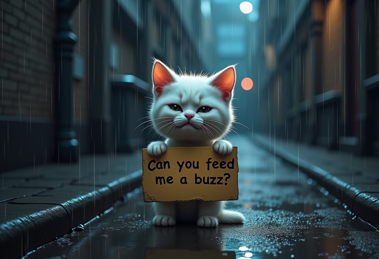 a poor white cat, crying, it holds a sign saying "Can you feed me a buzz?", on a dark alley way and it's rainy at night