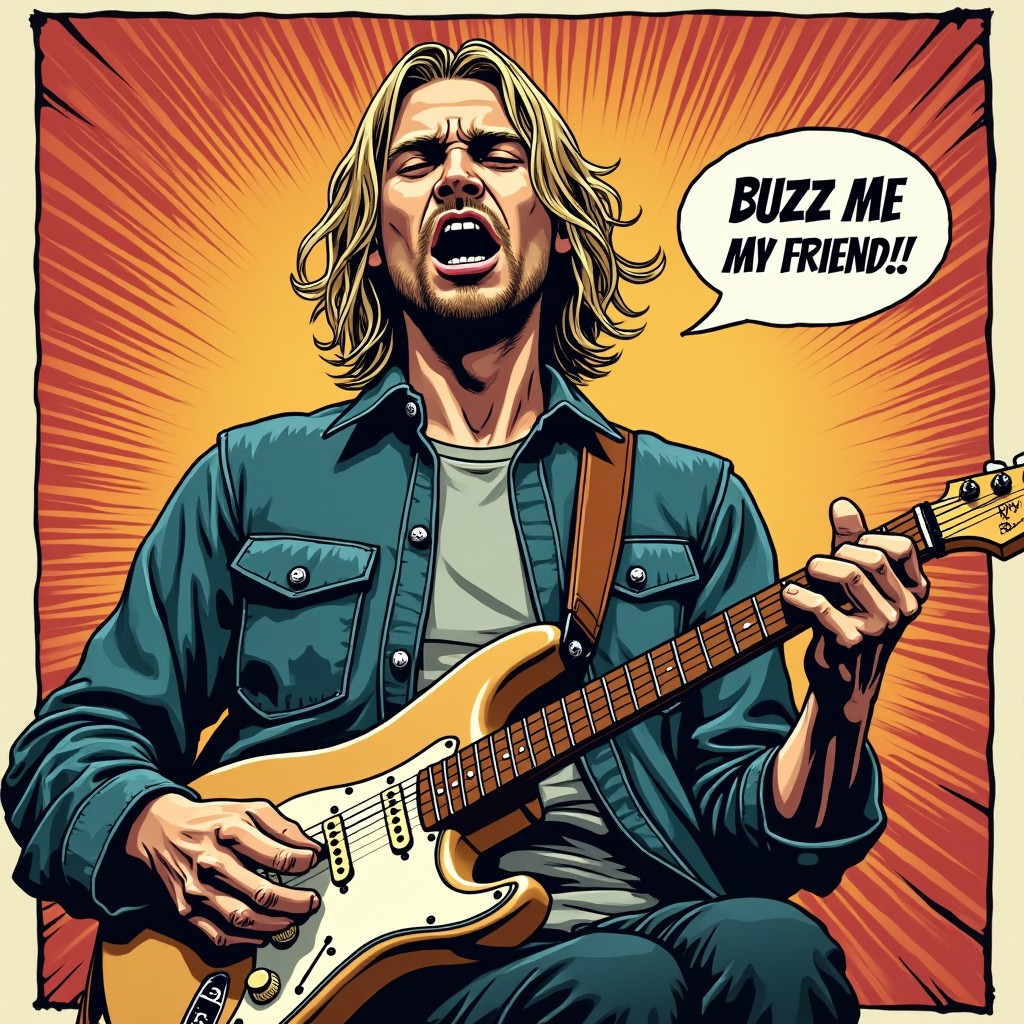 Kurt Cobain plays the guitar and shouts: "Buzz me my friend!!!" this inscription is like in a comic book when characters shout, expression, medium shot
