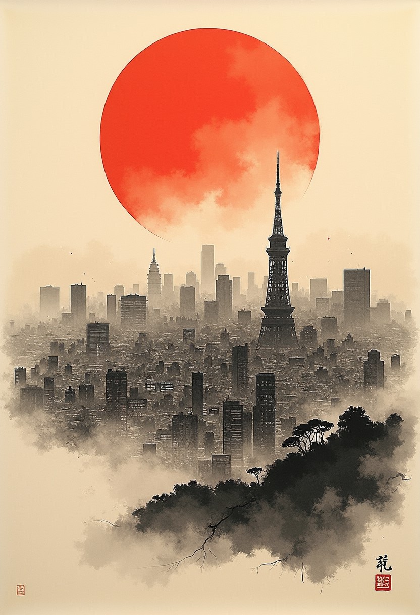 traditional japanese art style, ink on paper, aerial image of Tokyo, sunset, wabi-sabi, henna and carmine, sepia, minimal brush strokes Show More