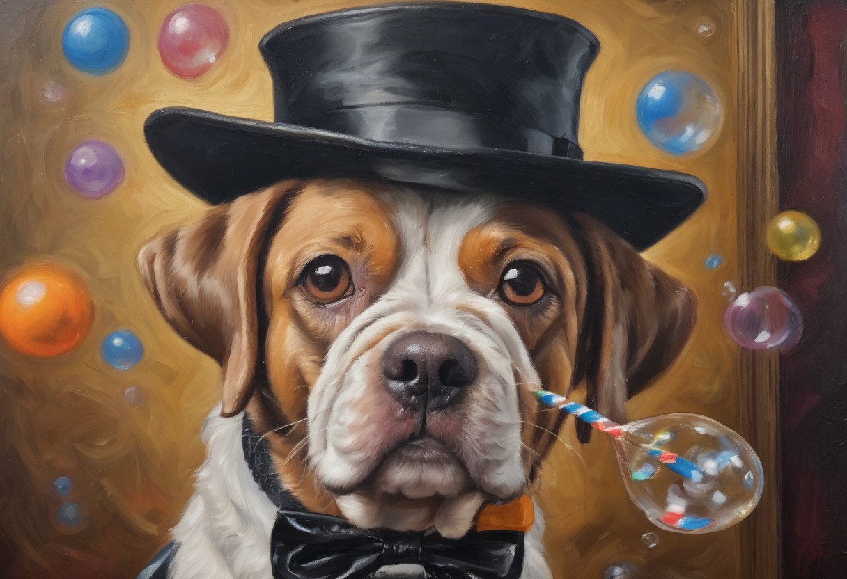 Oil painting, masterpiece, regal, fancy. A handsome dog named Puproy Doggerson III is dressed up like a detective for Halloween. He has a magnificent pipe that blows soap bubbles and a full bag of candy.