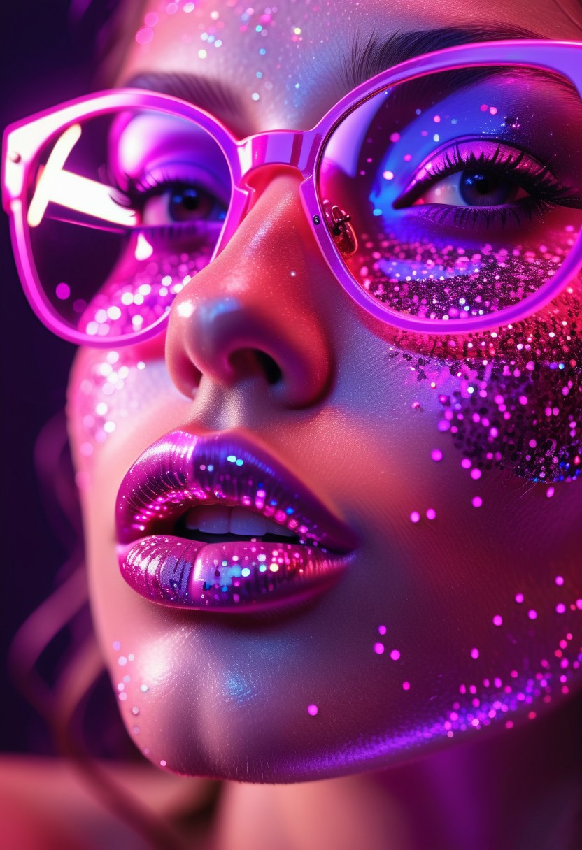 Neon-lit close-up, A hyper-realistic close-up of a beauty supermodel sexy girl face, big lips, bathed in neon pink and purple light with glittering particles on her skin, neon sunglasses with glitter textures patterns, fashion magazine style, beautiful background, Use soft colors and a shallow depth of field