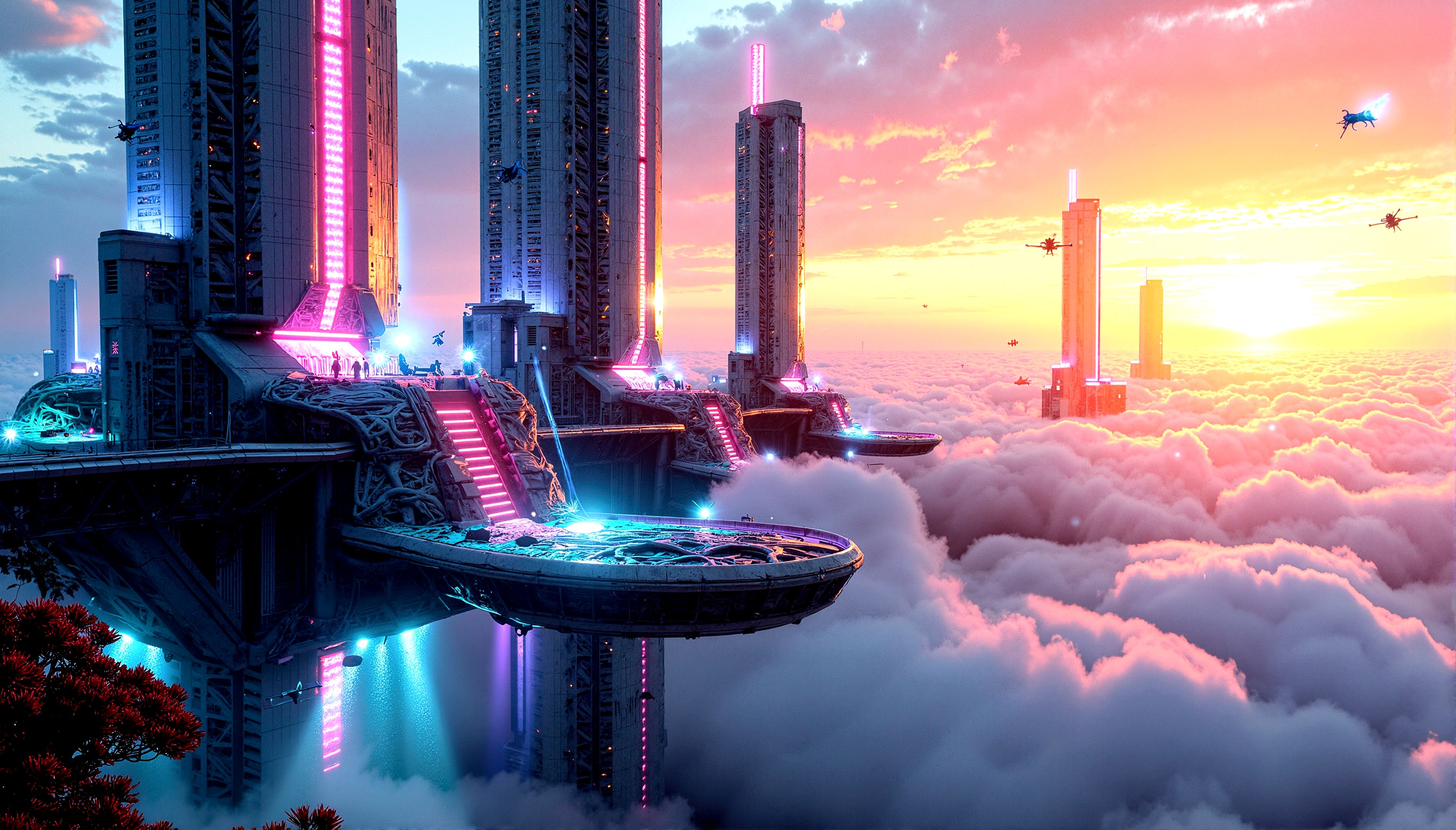 A city built on massive floating platforms above the clouds. Skyscrapers rise from the platforms, their bases shrouded in mist. The city is interconnected by sleek, transparent walkways, and the air is filled with flying vehicles and drones.Nature reclaiming parts of the city, with plants that glow with neon lights intertwined with the decaying architecture.Fields of plasma energy that distort light, creating shimmering waves of color and light around them. Random glitches in the holographic displays throughout the city, causing light to distort and break.Urban crystals that glow with a soft, inner light, embedded in the city's architecture. A sunset that glitches and shifts in color, with rays of light that break into pixels and reform as they pass through the atmosphere.