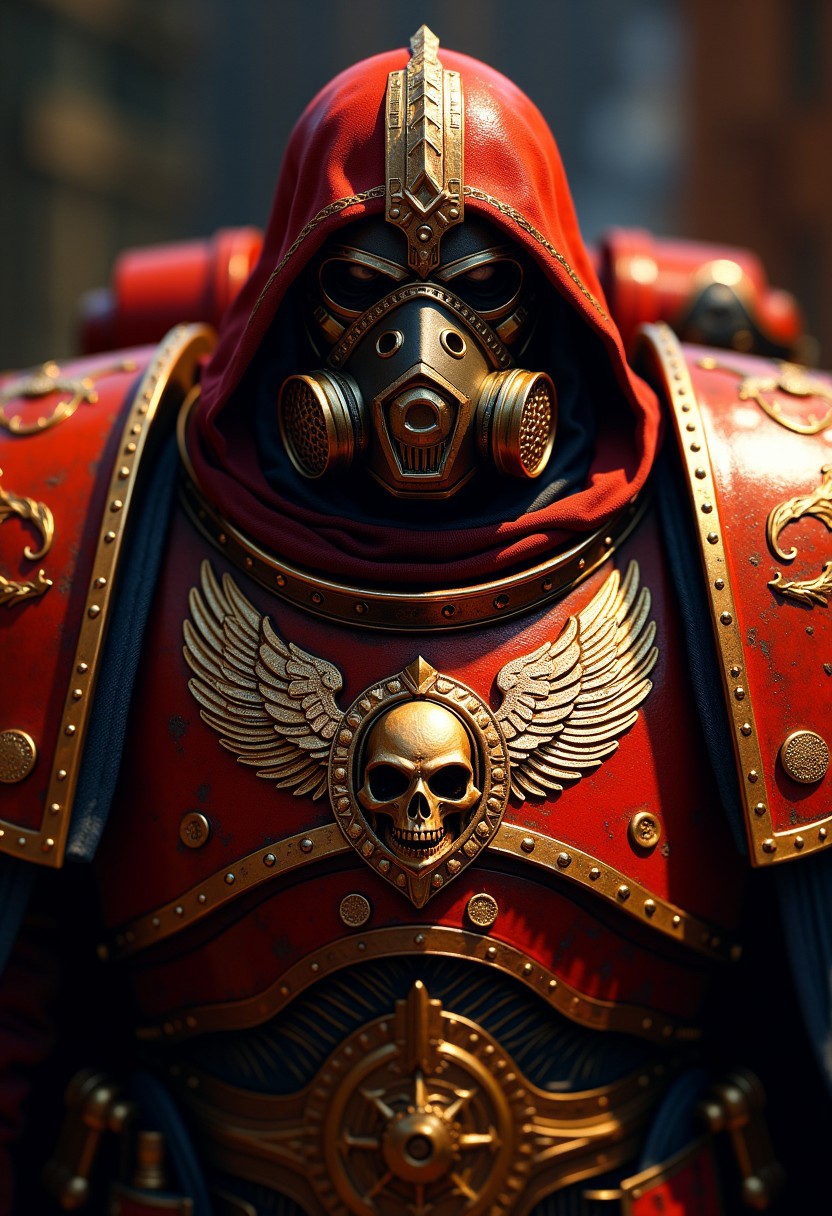 The heroic Blood Angels Space Marine Primarch from the world of Warhammer 40k, dons a menacing gas mask. His battle-hardened armour gleams with metallic red and shimmering gold accents, and the graphic on his chest shows a skull with angelic wings. The vivid imagery is reminiscent of stunning digital illustrations, capturing the Primarch's majestic stature and powerful presence. Just like the Space Marines, it transports viewers into an epic and thrilling sci-fi saga. <lora:flux.1_lora_flyway_Epic-Characters_v1.preview:1.0>